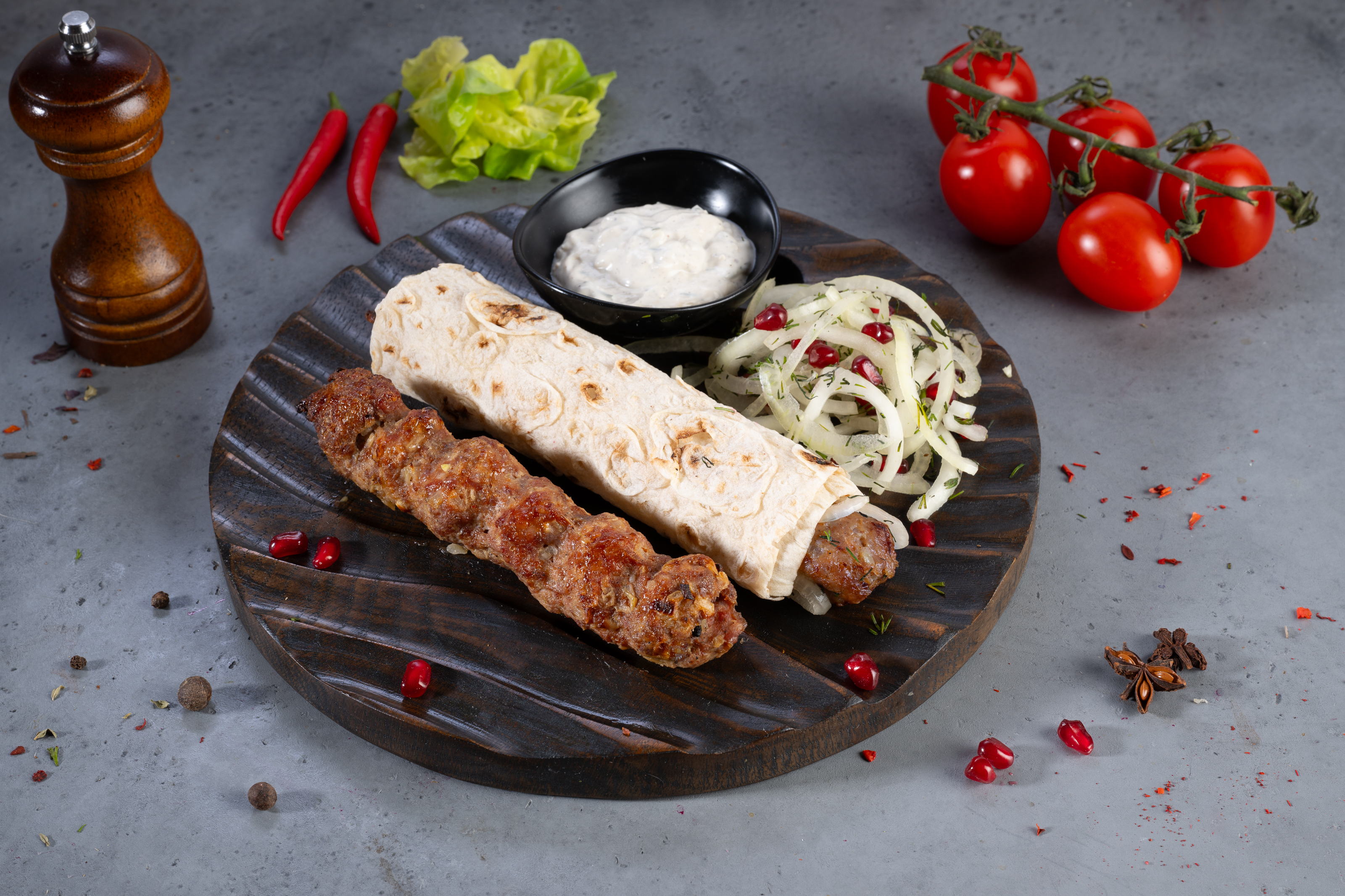 Люля-кебаб из курицы в тандыре — сытное и сочное блюдо. Нежный куриный люля, ароматный лаваш, хрустящий лук и гранат — яркое сочетание вкусов для ценителей мясных блюд